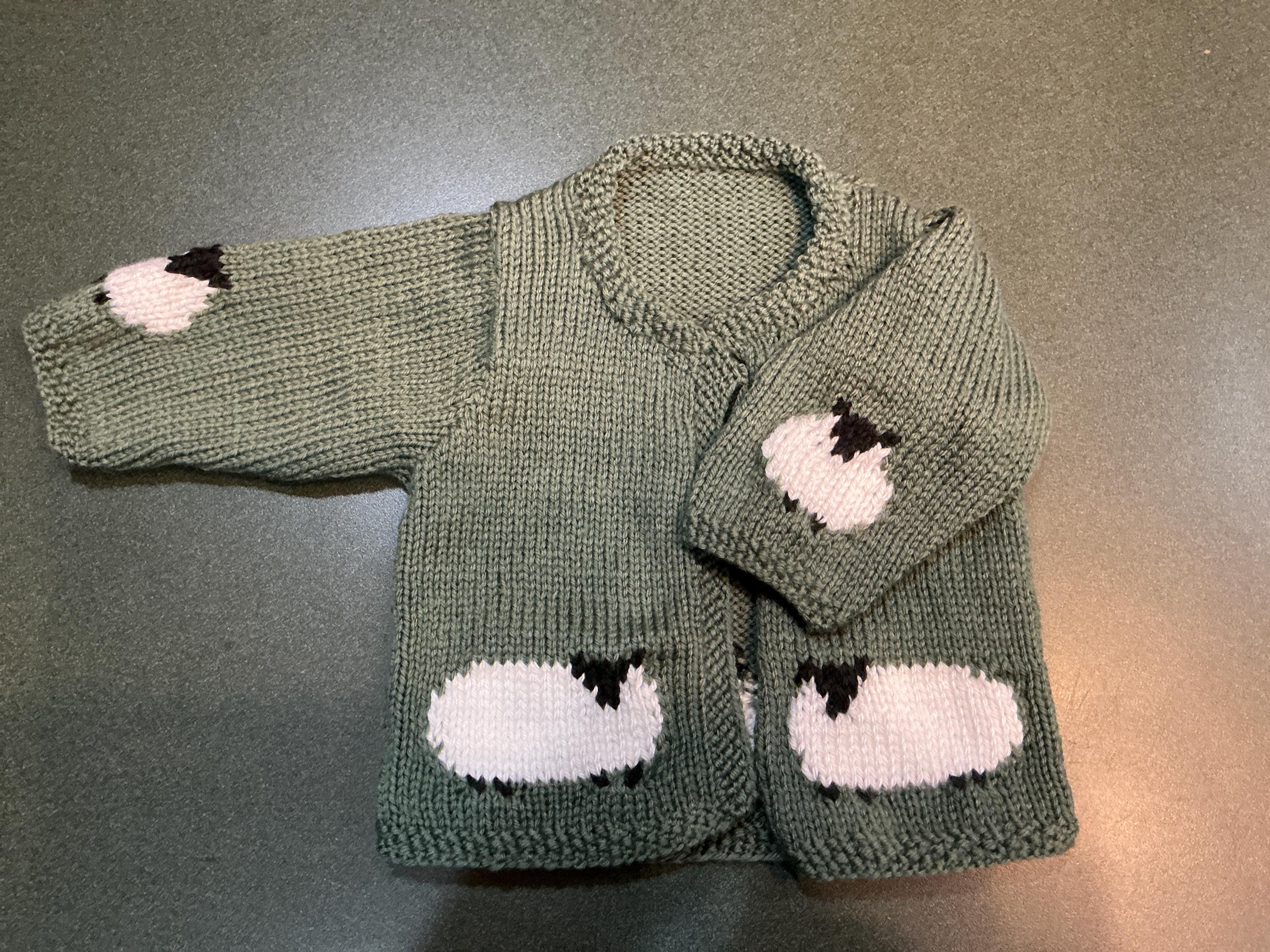 Pattern is easy to follow. I’m almost finished making it. Just waiting on some special buttons I ordered to finish it off. I added the middle sheep from the back onto the sleeves. This has been a fun little project.