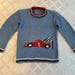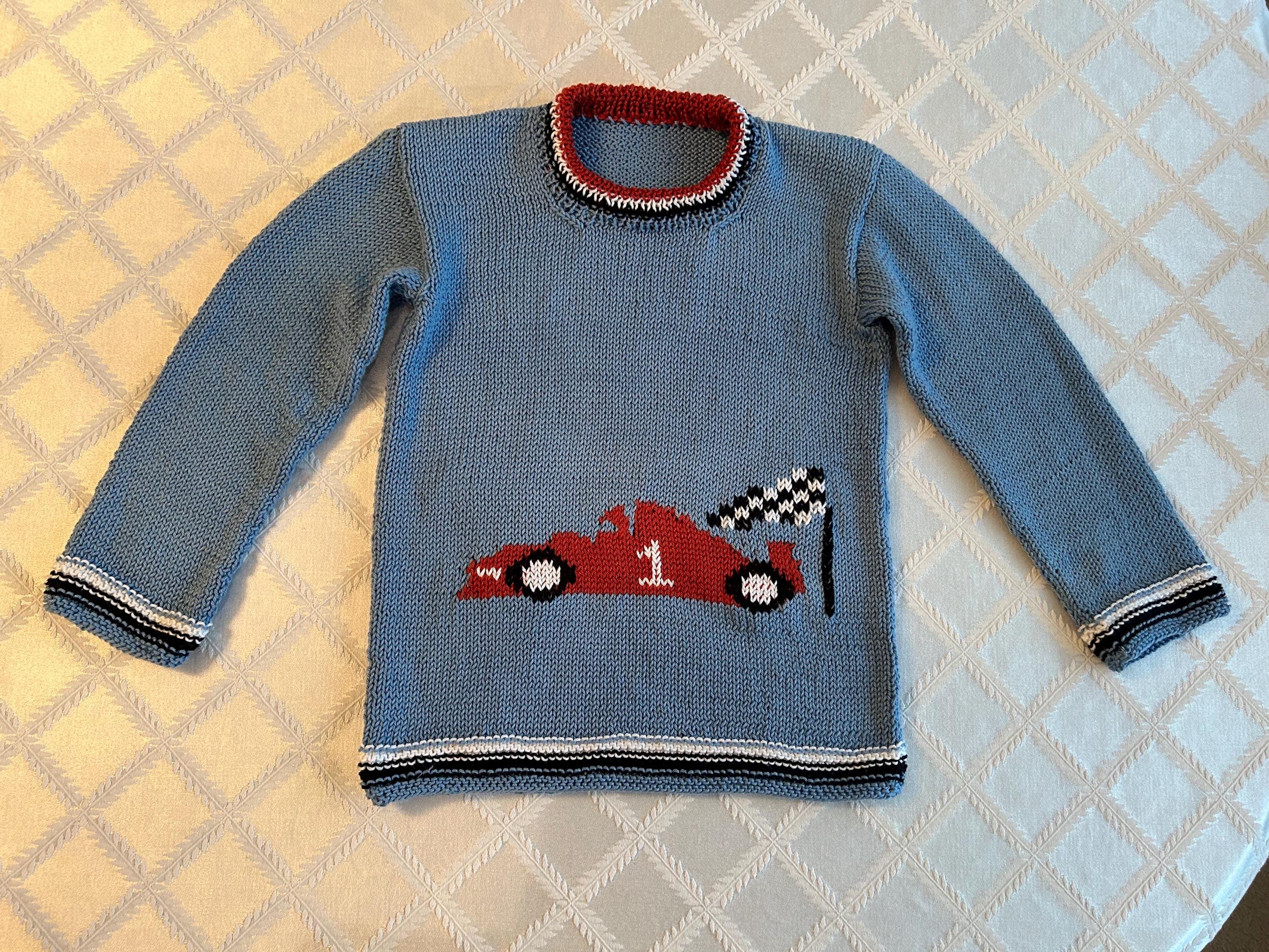 A lovely and interesting knit in double knitting (8 ply) yarn. There are contrast ribs using the same colours as the racing car